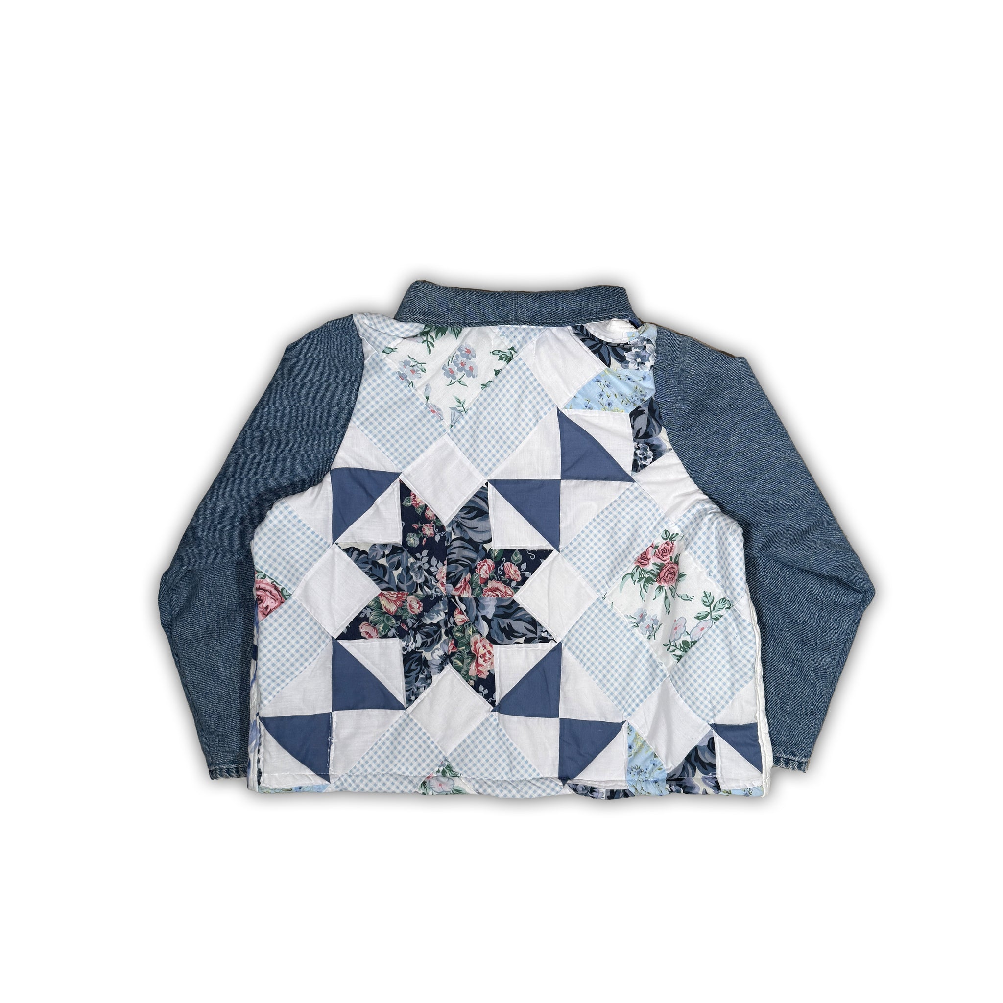 The body is constructed from multiple quilts, carefully selected and color-coordinated in soft blues and whites. Instead of pure randomness, the panels work together — different histories, unified palette.