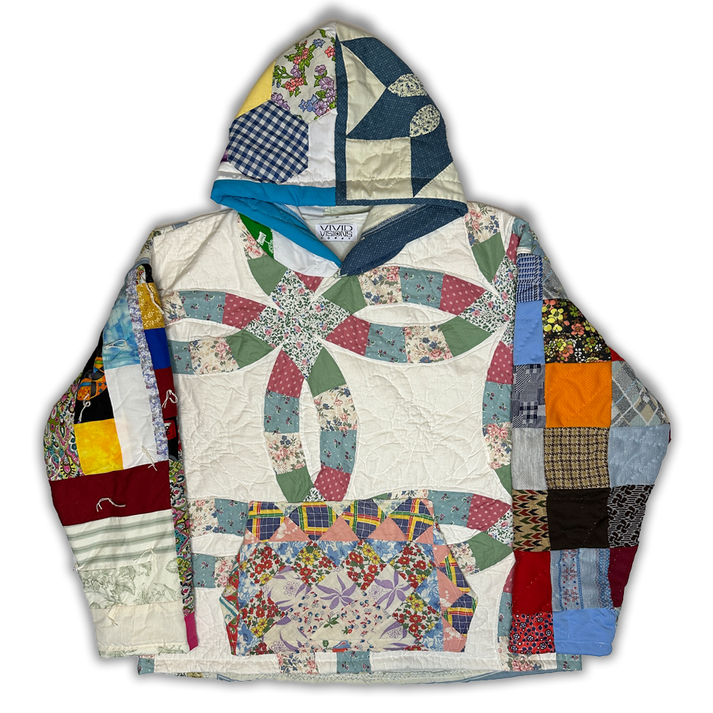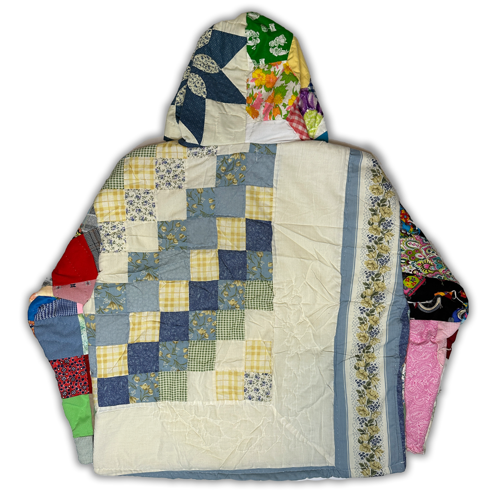 Each hoodie is made to order and constructed from a mix of vintage quilt scraps, with every panel thoughtfully selected and placed by hand. No two jackets will ever be the same.